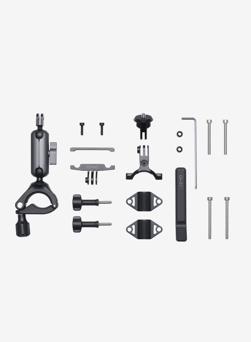 額外包含 Osmo 自行車車尾套件、Osmo 1 公尺高強度碳纖維隱形自拍桿、Osmo 可調節快拆轉接元件等,輕鬆拍攝震撼第三人稱全景騎行視角。支援多種角度快速調節,拍攝視角靈活自如。